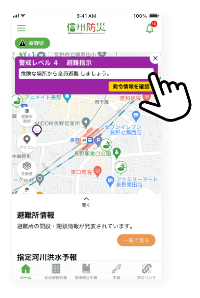 アプリを起動するとはじめに表示される画面です。災害発生に繋がる恐れのある情報が発表されている場合には、トップ画面上部に表示されます。
