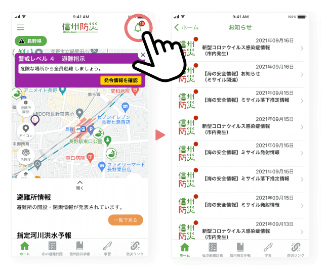 Lアラートの「お知らせ」情報を表示します。未読のお知らせがある場合は、アイコンの右上に未読数をバッチ表示します。長野県全体または選択した市町村の情報に絞り込み表示されます。