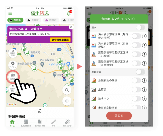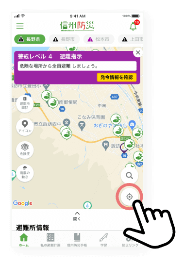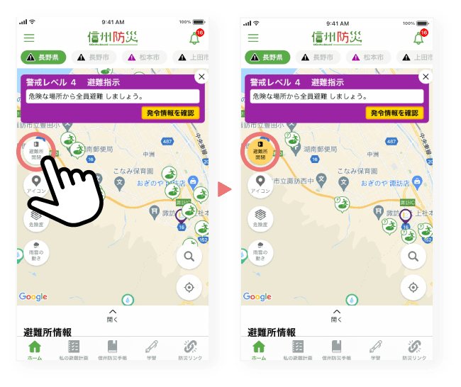 地図上には、表示をONにした避難所や避難場所、水防情報がアイコンで表示されます。