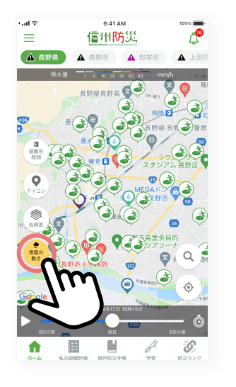 雨量情報を表示します。前後一時間の範囲で任意に時間を指定して情報を確認できます。「▶」ボタンを押すと雨雲の動きが再生されます。「時計」ボタンを押すと現在の情報に戻ります。