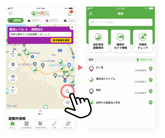 指定緊急避難場所、観測所カメラ情報を検索可能で、現在地から近い順で表示します。また、「危険度チェック」では、地点を指定して危険度を確認することもできます。