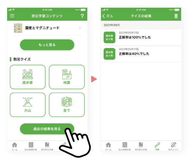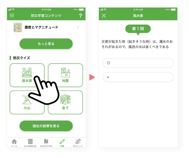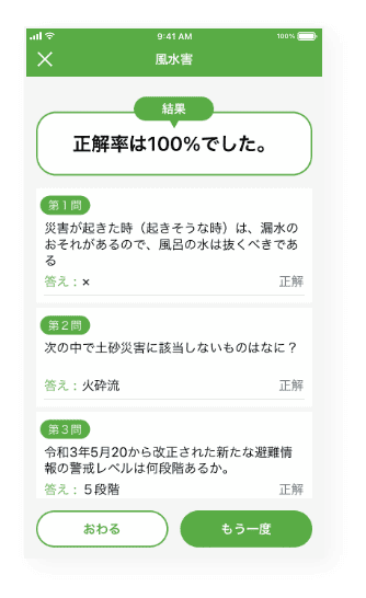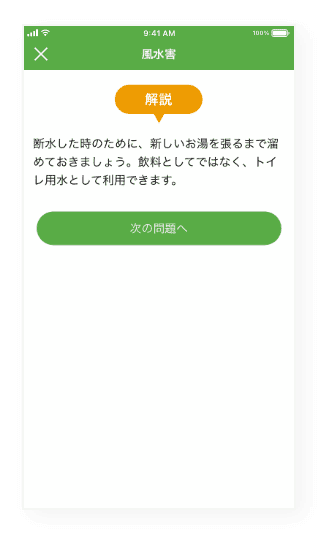 〇×や選択肢で回答します。クイズごとに解説も用意しています。